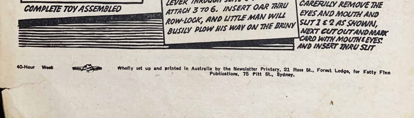 Wholly set up and printed in Australia by the Newsletter Printery, 21 Ross St., Forest Lodge, for Fatty Finn Publications, 75 Pitt St., Sydney.