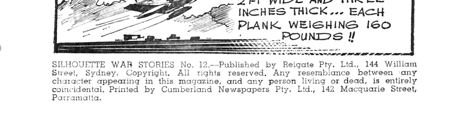 Silhouette War Stories No. 12--Published by Reigate Pty. Ltd., 144 William Street, Sydney. Copyright. All rights reserved. Any resemblence between characters in this magazine, and any person living or dead, is entirely coincidental. Printed by Cumberland Newspapers Pty. Ltd., 142 Macquarie Street, Parramatta. Distributed by Atlas Publishing and Distributing Company Limited, London; Gordon & Gotch (A'sia) Limited, Melbourne; Marketing Services (N.Z.) Ltd., New Zealand.