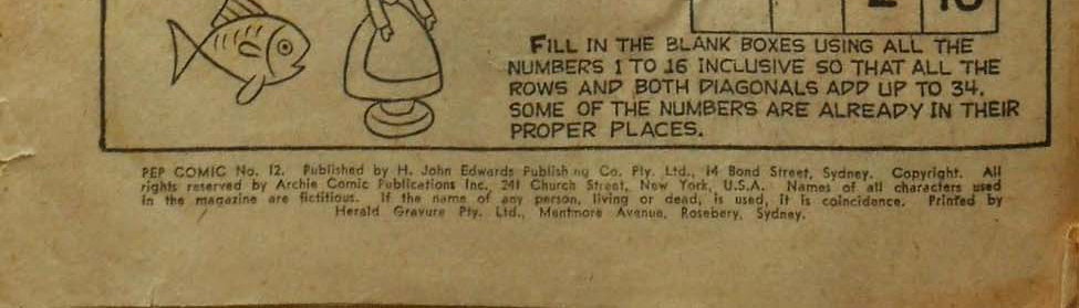 Pep Comic No. 12. Published by H. John Edwards Publishing Co. Pty. Lte., 14 Bond Street, Sydney. Copyright. All rights reserved by Archie Comic Publications Inc. 241 Church Street, New York, U.S.A. Names of all characters used in the magazine are fictitious. If the name of any person, living or dead, is used, it is a coincidence. Printed by Herald Gravure Pty. Ltd., Mentmore Avenue, Rosebery, Sydney.