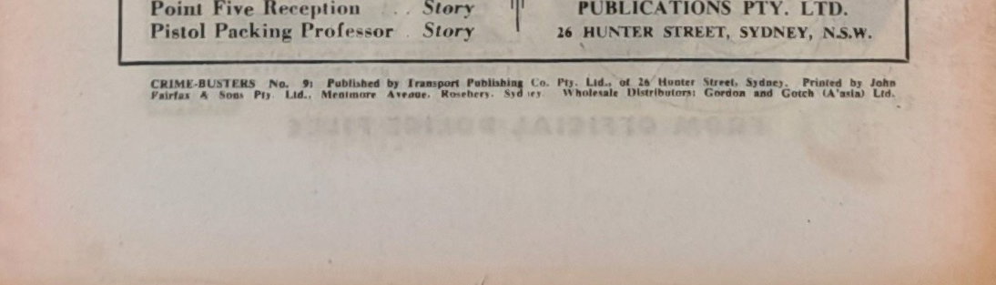 Crime-Busters No. 9. Published by Transport Publishing Co. Pty. Ltd., of 26 Hunter Street, Sydney. Printed by John Fairfax & Sons Pty. Ltd., Mentmore Avenue, Rosebery, Sydney. Wholesale Distributors Gordon and Gotch (A'asia) Ltd.