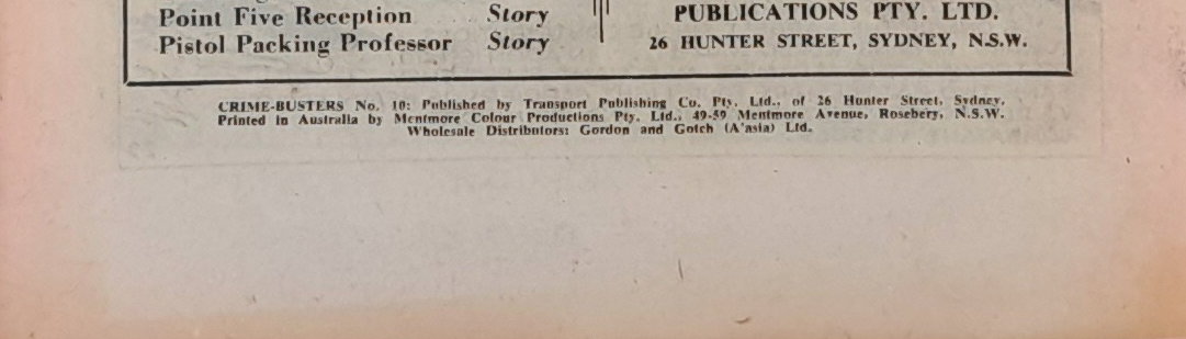 Crime-Busters No. 10: Published by Transport Publishing Co. Pty. Ltd., of 26 Hunter Street, Sydney. Printed in Australia by Mentmore Colour Productions Pty. Ltd., 49-59 Mentmore Avenue, Rosebery, N.S.W. Wholesale Distributors: Gordon and Gotch (A'asia) Ltd.