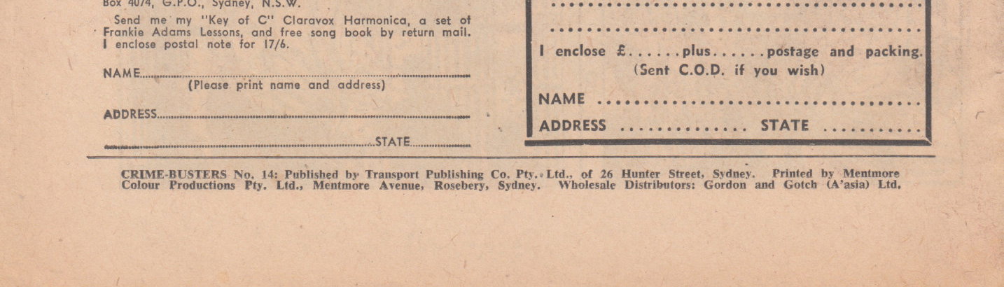 Crime-Busters No. 14: Pubished by Transport Publishing Co. Pty. Ltd., of 26 Hunter Street, Sydney. Printed by Mentmore Colour Productions Pty. Ltd., Mentmore Avenue, Rosebery, Sydney. Wholesale Distributors: Gordon and Gotch (A'asia) Ltd.