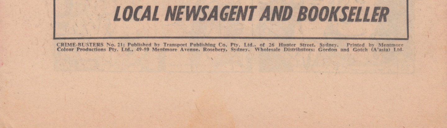 Crime-Busters No. 21. Published by Transport Publishing Co. Pty. Ltd., of 26 Hunter Street, Sydney. Printed by Mentmore Colour Productions Pty. Ltd., 49-59 Mentmore Avenue, Rosebery, Sydney. Wholesale Distributors: Gordon and Gotch (A'asia) Ltd.