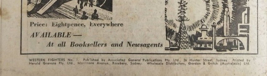 WESTERN FIGHTERS No. 1. Published by Associated General Publications Pty. Ltd., 26 Hunter Street, Sydney. Printed by Herald Gravure Pty. Ltd., Mentmore Avenue, Rosebery, Sydney. Wholesale Distributors, Gordon & Gotch (Australasia) Ltd.