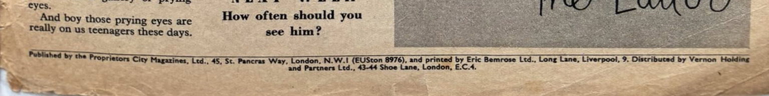 Published by the Proprietors City Magazines, Ltd., 45, St. Pancras Way, London, N.W.1 (EUSton 8976), and printed by Eric Bemrose Ltd., Long Lane, Liverpool, 9. Distributed by Vernon Holding and Partners Ltd., 43-44 Shoe Lane, London, E.C.4.