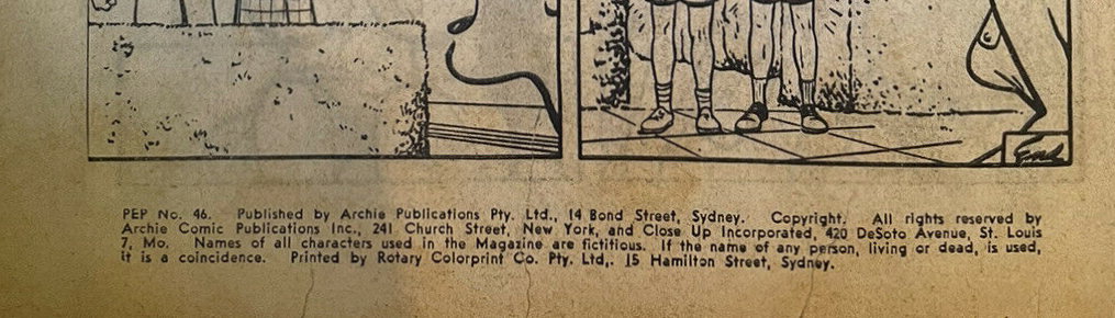 Pep No. 46. Published by Archie Publications Pty. Ltd., 14 Bond Street, Sydney. Copyright. All rights reserved by Archie Comic Publications Inc., 241 Church Street, New York, and Close UP Incorporated, 420 DeSoto Avenue, St. Louis 7, Mo. Names of all characters used in the Magazine are fictitious. If the name of any person, living or dead is used, it is a coincidence. Printed by Rotary Colrprint Co. Pty. Ltd., 15 Hamilton Street, Sydney.