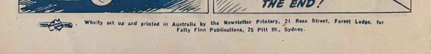 Wholly set up and printed in Australia by the Newsletter Printery, 21 Ross Street, Forest Lodge, for Fatty Finn Publications, 25 Pitt St., Sydney.