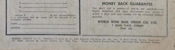 Reggie Comic No. 3. Published in A/sia by H. John Edwards Publishing Co. Pty. Ltd., 14 Bond St., Sydney. Copyright. All rights reserved by Archie Comics Inc., New York. Printed by Herald Gravure Pty. Ltd., Mentmore Ave., Rosebery, Sydney.