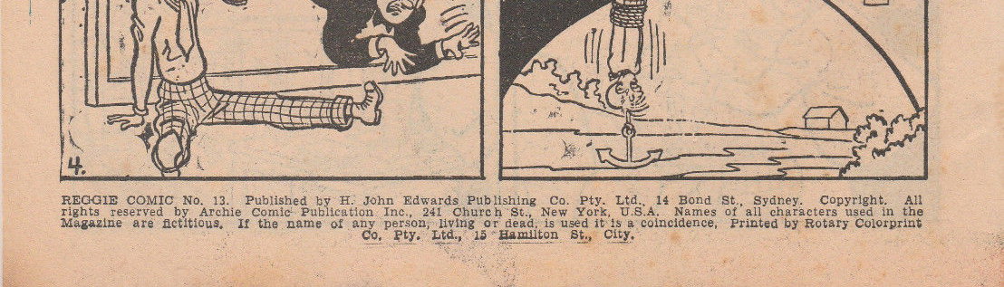 Reggie Comic No. 13. Published by H. John Edwards Publishing Co. Pty. Ltd., 14 Bond St., Sydney. Copyright. All rights reserved by Archie Comic Publication Inc., 241 Church St., New York, U.S.A. Names of all characters used in the magazine are fictitious. If the name of any person, living or dead, is used it is a coincidence. Printed by Rotary Colorprint Co. Pty. Ltd., 15 Hamilton St., City.