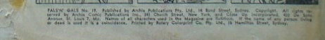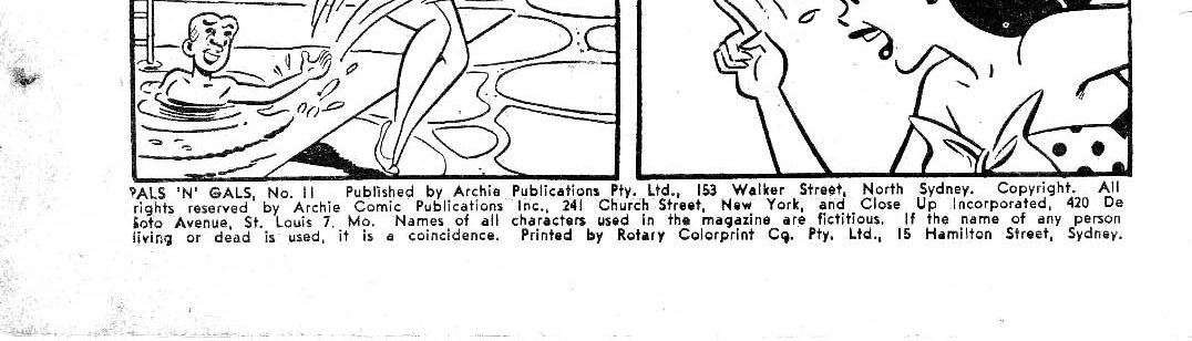 Pals 'n' Gals, No. 11. Published by Archie Publications Pty. Ltd., 153 Walker Street, North Sydney. Copyright. All rights reserved by Archie Comic Publications Inc., 241 Church Street, New York, and Close Up Incorporated, 420 De Soto Avenue, St. Louis 7, Mo. Names of all characters used in the magazine are fictitious. If the name of any person living or dead is used, it is a coincidence. Printed by Rotary Colorprint co. Pty. Ltd., 15 Hamilton Street, Sydney.