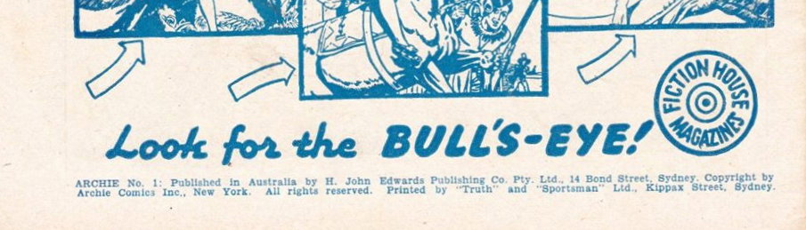 Archie No. 1: Published in Australia by H. John Edwards Publishing Co. Pty. Ltd., 14 Bond Street, Sydney. Copyright by Archie Comics Inc., New York. All rights reserved. Printed by "Truth" and Sportsman" Ltd., Kippax Street, Sydney.
