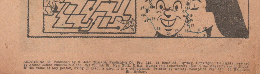 Archie No. 44. Published by H. John Edwards Publishing Co. Pty. Ltd., 14 Bond St., Sydney. Copyright. All rights reserved by Archie Comic Publications Inc., 241 Church St., New York, U.S.A. Names of all characters used in the magazine are fictitious. If the name of any person, living or dead, is used, it is a coincidence. Printed by Rotary Colorprint Pty. Ltd., 15 Hamilton St., Sydney.