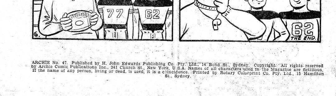 Archie No. 47. Published by H. John Edwards Publishing Co. Pty. Ltd., 14 Bond St., Sydney. Copyright. All rights reserved by Archie Comic Publications Inc., 241 Church St., New York, U.S.A. Names of all characters used in the Magazine are fictitious. If the name of any person, living or dead, is used, it is a coincidence. Printed by Rotary Colorprint Co. Pty. Ltd., 15 Hamilton St. Sydney.