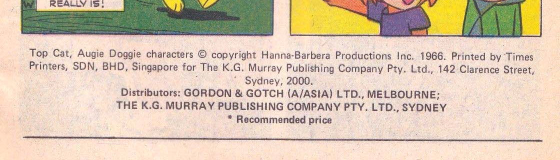 Top Cat, Augie Doggie characters © copyright Hanna-Barbera Productions Inc. 1966. Printed by Times Printers, SDN, BHD, Singapore for The K.G. Murray Publishing Company Pty. Ltd., 142 Clarence Street, Sydney, 2000. Distributors: Gordon & Gotch (A/asia) Ltd., Melbourne; The K.G. Murray Publishing Company Pty. Ltd., Sydney.