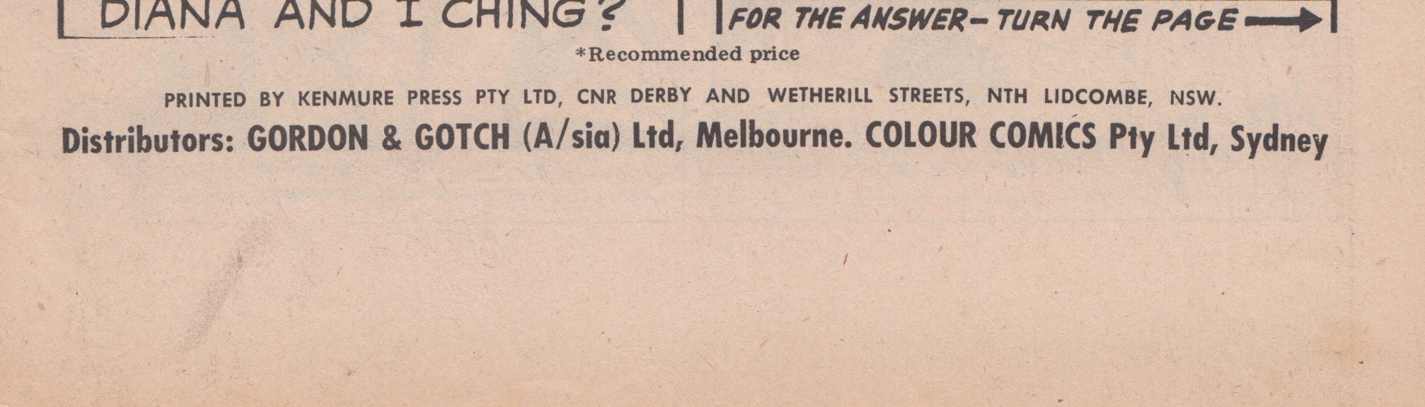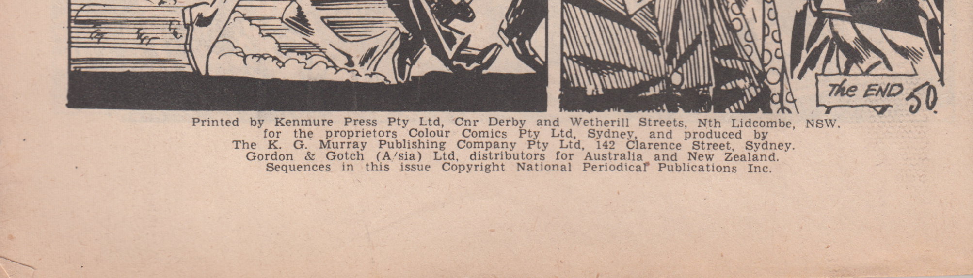 Printed by Kenmure Press Pty Ltd, Cnr Derby and Wetherill Streets, Nth Lidcombe, NSW, for the proprietors Colour Comics Pty Ltd, Sydney, and produced by The K. G. Murray Publishing Company Pty Ltd, 142 Clarence Street, Sydney. Gordon & Gotch (A/sia) Ltd, distributors for Australia and New Zealand. Sequences in this issue copyright National Periodical Publications Inc.