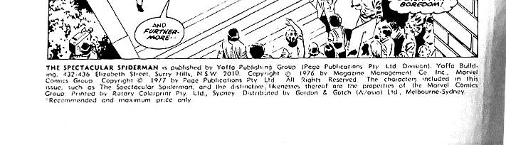 The Spectacular Spiderman is published by Yaffa Publishing Group (Page Publications Pty Ltd Division), Yaffa Building, 432-436 Elizabeth Street, Surry Hills, N.S.W. 2010. Copyright © 1976 by Magazine Management Co. Inc., Marvel Comics Group Copyright © 1977 by Page Publications Pty Ltd. All rights reserved. The characters included in this issue, such as the Spectacular Spiderman [sic], and the distinctive likenesses thereof are the properties of the Mar5vel Comics Group. Printed by Rotary Colorprint Pty. Ltd., Sydney. Distributed by Gordon & Gotch (A/asia) Ltd, Melbourne-Sydney.