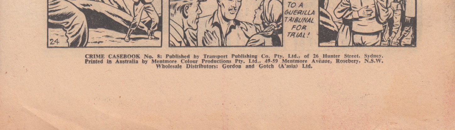 Crime Casebook No. 8: Published by Transport Publishing Co., Pty. Ltd., of 26 Hunter Street, Sydney. Printed in Australia by Mentmore Colour Productions Pty. Ltd., 49-59 Mentmore Avenue, Rosebery, N.S.W. Wholesale Distributors: Gordon and Gotch (A'sia) Ltd.