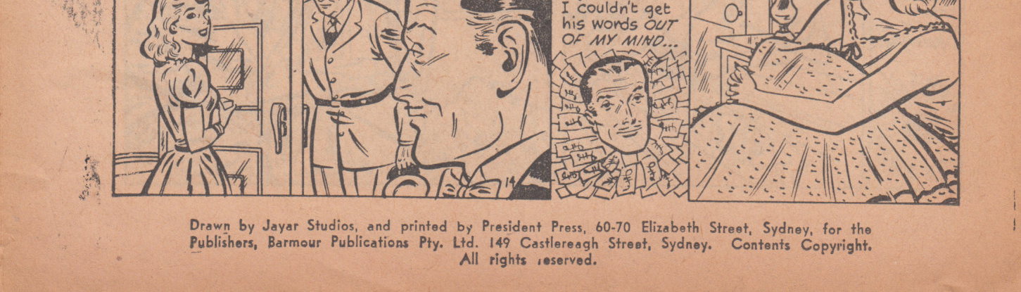 Drawn by Jayar Studios and printed by President Press, 60-70 Elizabeth Street, Sydney, for the Publishers, Barmour Publications Pty. Ltd. 149 Castlereagh street, Sydney. Contents copyright. All rights reserved.