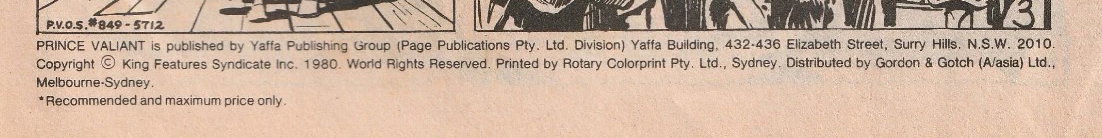 PRINCE VALIANT is published by Yaffa Publishing Group (Page Publications Pty. Ltd. Division) Yaffa Building, 423-436 Elizabeth Street, Surry Hills, N.S.W. 2010. Copyright © King Features syndicate Inc, 1980. World rights Reserved. Printed by Rotary Colorprint Pty. Ltd., Sydney. Distributed by Gordon & Gotch (A/asia) Ltd., Melbourne-Sydney.