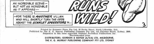 Printed by Kenmure Press Pty Ltd, 50 Derby Street, North Lidcombe, 2141. Published by The K. G. Murray Publishing Company Pty Ltd, 142 Clarence Street, Sydney, 2000. Sequences in this issue copyright National Periodical Publications Inc. Distributors: Gordon & Gotch (A/sia) Ltd, Melbourne, The K. G. Murray Publishing Company Pty Ltd, Sydney.
