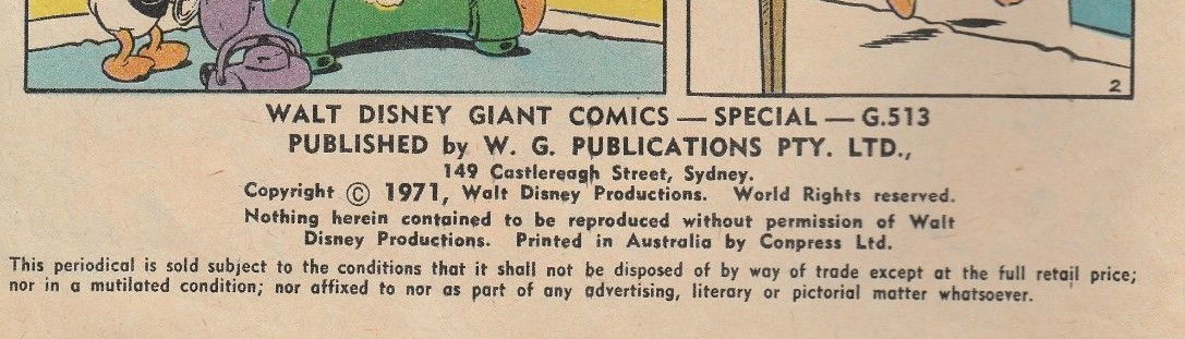 Walt Disney Giant comics -- Special -- G.513. Published by W. G. Publications Pty. Ltd., 19 Castlereagh Street, Sydney. Copyright © 1971, Walt Disney Productions. World rights reserved. Nothing herin contained to be reproduced without permission of Walt Disney Productions. Printed in Australia by Conpress Ltd.