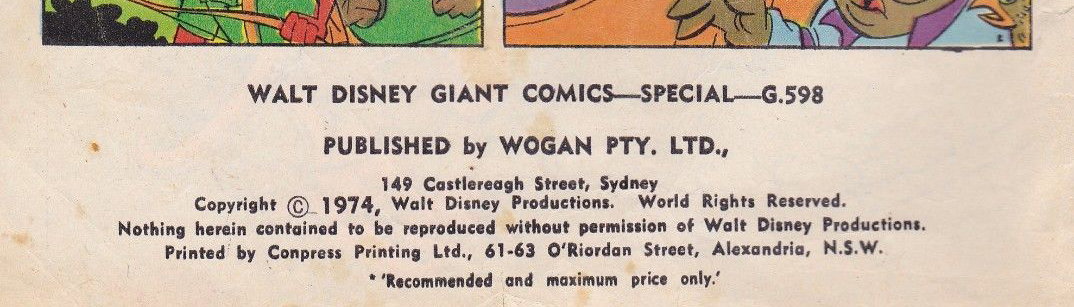 Walt Disney Giant Comics—Special—G.598. Published by Wogan Pty. Ltd., 149 Castlereagh Street, Sydney. Copyright © 1974, Walt Disney Productions. World rights reserved. Nothing herin contained to be reproduced without permission of Walt Disney Productions. Printed by Conpress Printing Ltd., 61-63 O'Riordan Street, Alexandria, N.S.W.