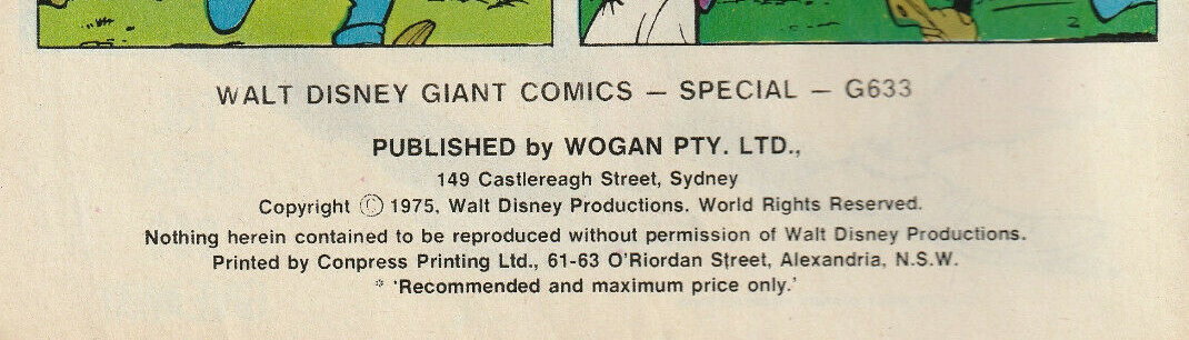 Walt Disney Giant Comics—Special—G633. Published by Wogan Pty. Ltd., 149 Castlereagh Street, Sydney. Copyright © 1975. Walt Disney Productions. World Rights Reserved. Printed by Conpress Printing Ltd., 81-83 O'Riordan Street, Alexandria, N.S.W.