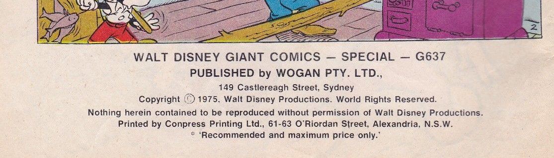 Walt Disney Giant Comics—Special—G637. Published by Wogan Pty. Ltd., 149 Castlereagh Street, Sydney. Copyright © 1975. Walt Disney Productions. World rights reserved. Nothing herin contained to be reproduced without permission of Walt Disney Productions. Printed by Conpress Printing Ltd., 61-63 O'Riordan Street, Alexandria, N.S.W.