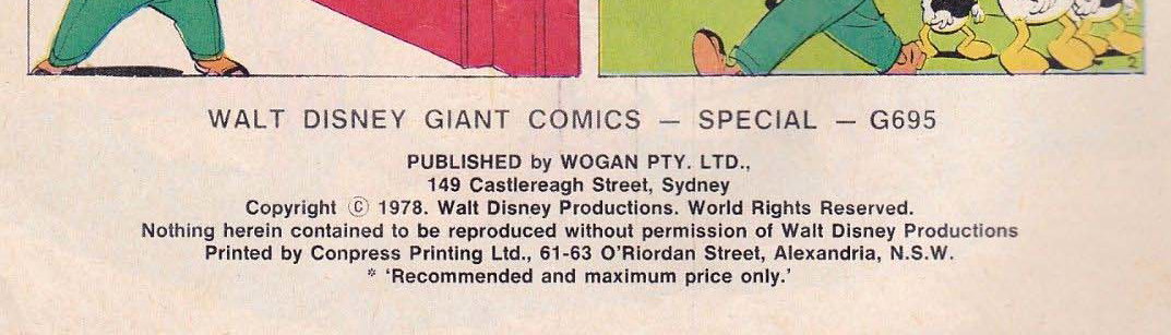 Walt Disney Giant Comics -- Special -- G695. Published by Wogan Pty. Ltd., 149 Castlereagh Street, Sydney. Copyright © 1978. Walt Disney Productions… Printed by Conpress Printing Ltd., 61-63 O'Riordan Street, Alexandria, N.S.W.