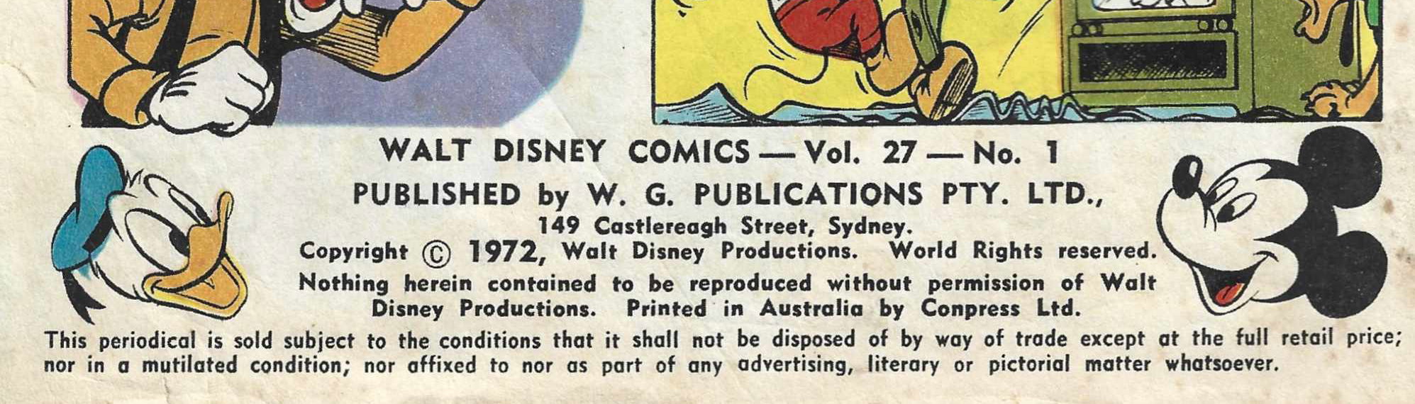 Walt Disney Comics -- Vol. 27 -- No. 1 published by W. G. Publications Pty. Ltd., 149 Castlereagh Street, Sydney. Copyright © 1972, Walt Disney Productions. World Rights reserved. Nothing herin contained to be reproduced without permission of Walt Disney Productions. Printed in Australia by Conpress Ltd.