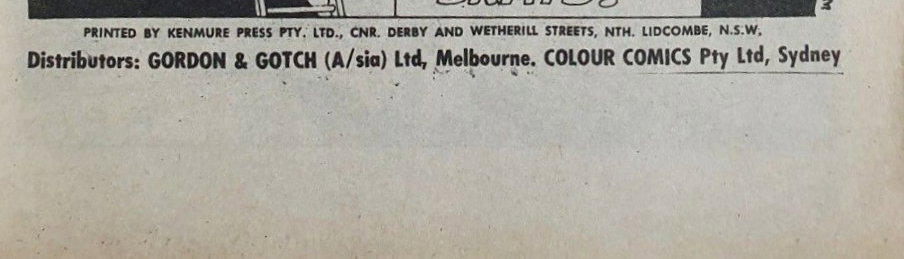 Printed by Kenmure Press Pty. Ltd., Cnr Derby and Wetherill Streets Nth Lidcombe, NSW, for the Proprietors Colour Comics Pty. Ltd., Sydney, and produced by The K. G. Murray Publishing Company Pty. Ltd., 142 Clarence Street, Sydney. Gordon & Gotch (A/sia) Ltd., distributors for Australia and New Zealand. Sequences in this issue Copyright National Periodical Publications Inc.