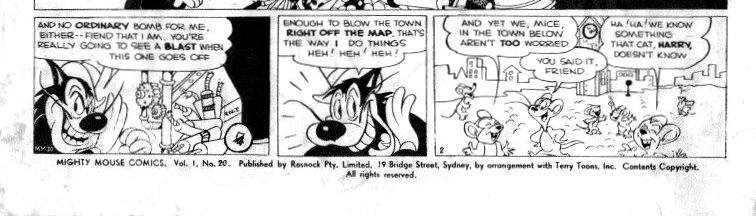 Mighty Mouse Comics. Vol. 1. No. 20. Published by Rosnock Pty. Limited, 19 Bridge Street, Sydney, by arrangement with Terry Toons, Inc. Contents copyright. All rights reserved. Mighty Mouse Comics. Drawn and printed in Australia by Jayar Studios and Sungravure Ltd.