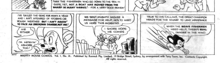 Mighty Mouse Comics. Vol. 1. No. 21. Published by Rosnock Pty. Limited, 19 Bridge Street, Sydney, by arrangement with Terry Toons, Inc. Contents copyright. All rights reserved. Mighty Mouse Comics. Drawn and printed in Australia by Jayar Studios and Sungravure Ltd.