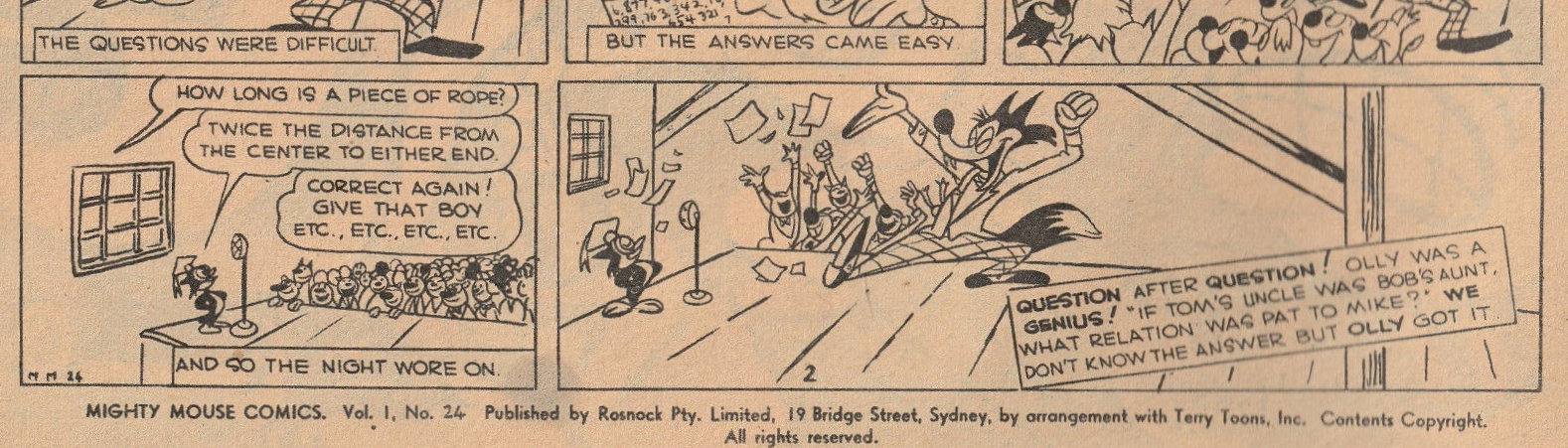 Mighty Mouse Comics. Vol. 1, No. 24. Published by Rosnock Pty. Limited, 19 Bridge Street, Sydney, by arrangement with Terry Toons. Inc. Contents Copyright. All rights reserved. Mighty Mouse Comics. Drawn and printed in Australia by Jayar Studios and Sungravure Limited.