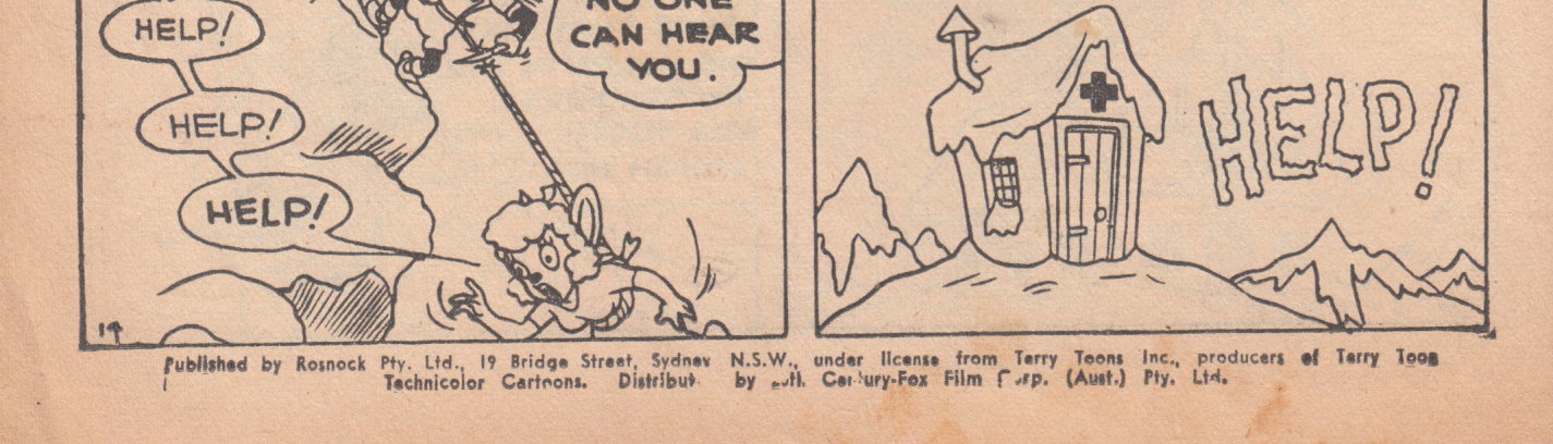 Published by Rosnock Pty. Ltd., 19 Bridge Street, Sydney N.S.W. under licence from Terry Toons Inc., producers of Terry Toon Technicolor Cartoons. Distributed // Century-Fox Film Corp. (Aust.) Pty. Ltd. Printed in Australia y Associated Newspapers Ltd. Entire contents copyright. All rights reserved.