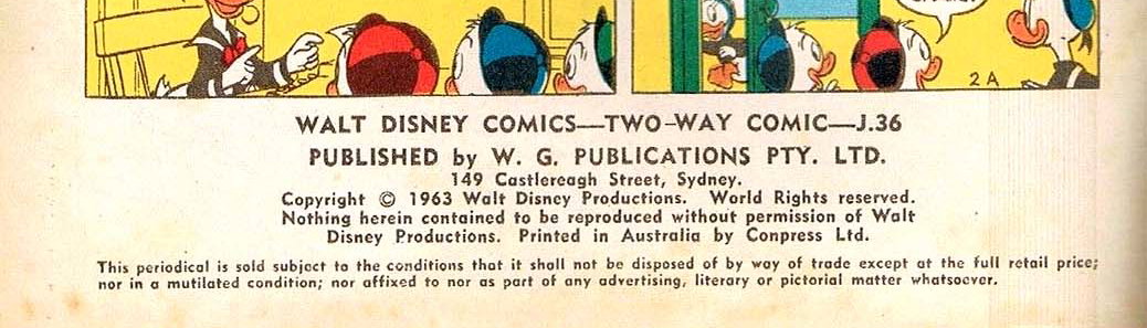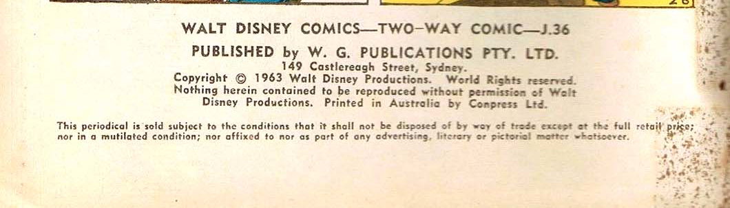 Walt Disney Comics—Two-Way Comic—J.36. Published by W.G. Publications Pty. Ltd. 149 Castlereagh Street, Sydney. Copyright © 1963 Walt Disney Productions. World rights reserved. Nothing herin contained to be reproduced without permission of Walt Disney Productions. Printed in Australia by Conpress Ltd.
