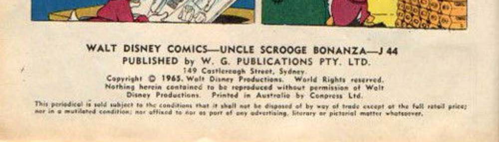 Walt Disney Comics—Uncle Scrooge Bonanza—J 44 published by W. G. Publications Pty. Ltd. 149 Castlereagh Street, Sydney. Copyright © 1965. Walt Disney Productions. World rights reserved. Nothing herin contained to be reproduced without permission of Walt Disney Productions. Printeed in Australia by Conpress Ltd.