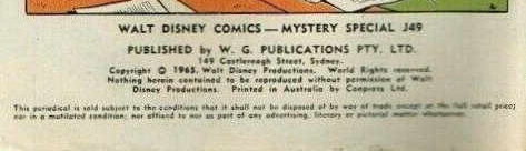 Walt Disney Comics -- Mystery Special J49. Published by W. G. Publications Pty. Ltd. 149 Castlereagh Street, Sydney. Copyright © 1965. Walt Disney Productions. World Rights Reserved. Nothing herein contained to be reproduced without permission of Walt Disney Productions. Printed in Australia by Conpress Ltd.