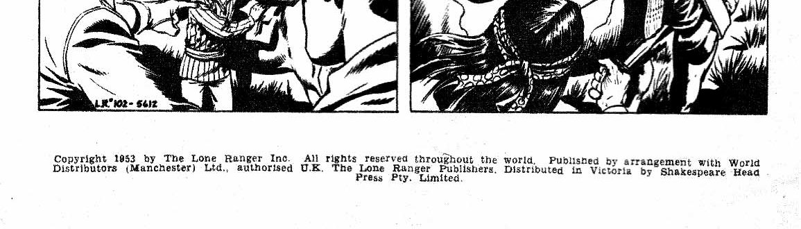 Printed by Conpress Printing Ltd. for the publishers, Shakespeare Head Press Pty. Limited, 195 Elizabeth Street, Sydney. Copyright 1953 by The Lone Ranger Inc. All rights reserved throughout the world. Published by arrangement with World Distributors (Manchester) Ltd., authorised U.K. The Lone Ranger Publishers. Distributed in Victoria by Shakespeare Head Press Pty. Limited.