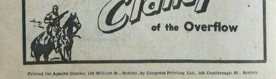 Printed for Apache Comics, 144 William St, Sydney by Conpress Printing Ltd. 168 Castlereagh St, Sydney. Distributed by Gordon and Gotch (A'sia) Limited 511-515 Little Collins Street, Melbourne.