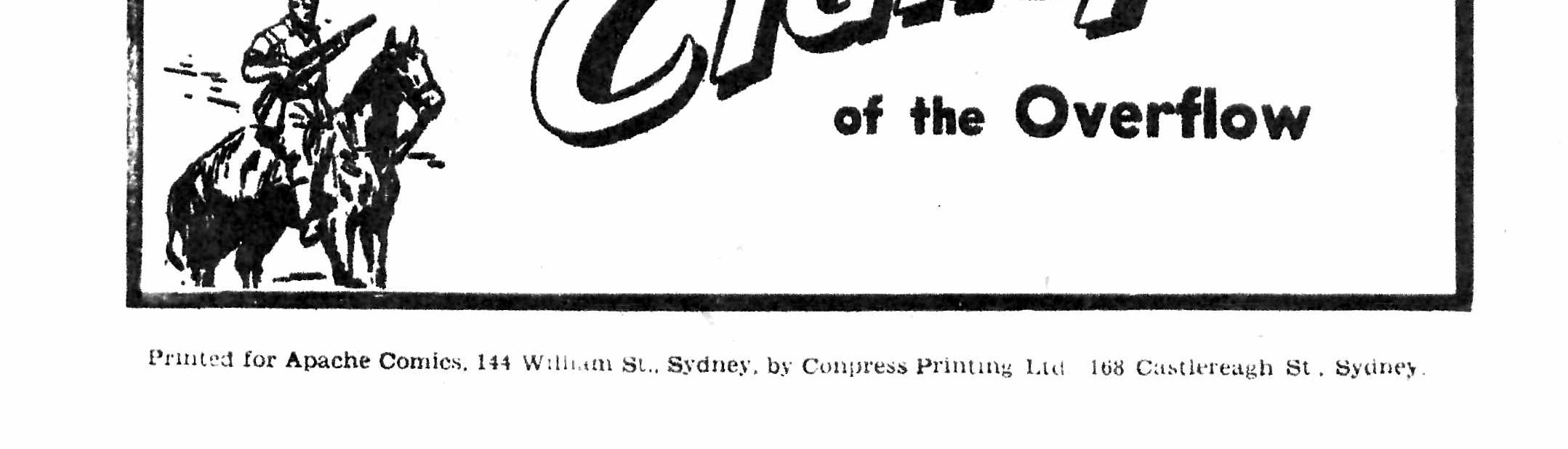 Printed for Apache Comics, 144 William St, Sydney by Conpress Printing Ltd. 168 Castlereagh St, Sydney.