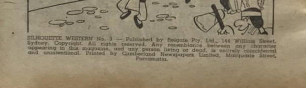 Silhouette Western No. 3.--Published by Reigate Pty. Ltd., 144 William Street, Sydney. Copyright. All rights reserved. Any resemblance between any character appearing in this magazine, and any person living or dead, is entirely coincidental and unintentional. Printed by Cumberland Newspapers Limited, Macquarie Street, Parramatta.