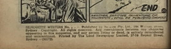 Silhouette Western No. 19.--Published by Reigate Pty. Ltd., 144 William Street, Sydney. Copyright. All rights reserved. Any resemblance between any character appearing in this magazine, and any person living or dead, is entirely coincidential and unintentional. Printed by The Land Newspaper Limited, 57-59 Regetn Street, Sydney.--(50273).