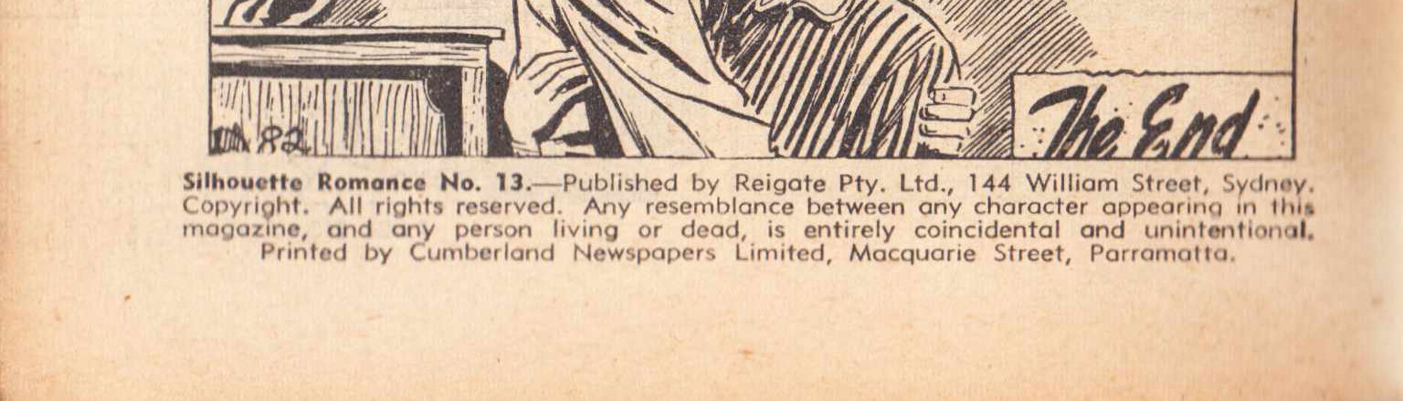 Silhouette Romance No. 13.--Published by Reigate Pty. Ltd., 144 William Street, Sydney. Copyright. All rights reserved. Any resemblance between any character appearing in this magazine, and any person living or dead, is entirely coincidental and unintentional. Printed by Cumberland Newspapers Limited, Macquarie Street, Parramatta.