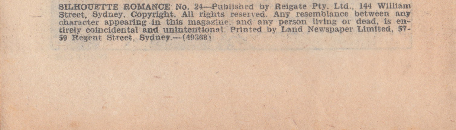 Silhouette Romance No. 24--Published by Reigate Pty. Ltd., 144 William Street, Sydney. Copyright. All rights reserved. Any resemblance between any character appearing in this magazine, and any person living or dead is entirely coincidencal and unintentional. Printed by Land Newspaper Limited, 57-59 Regent Street, Sydney.--(49583)