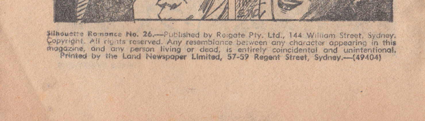 Silhouette Romance No. 26.--Published by Reigate Pty. Ltd., 144 William Street, Sydney. Copyright. All rights reserved. Any resemblance between any resemblance between any character appearing in this magazine, and any person living or dead, is entirely coincidental and unintentional Printed by the Land Newspaper Limited, 57-59 Regent Street, Sdyney.--(49404)