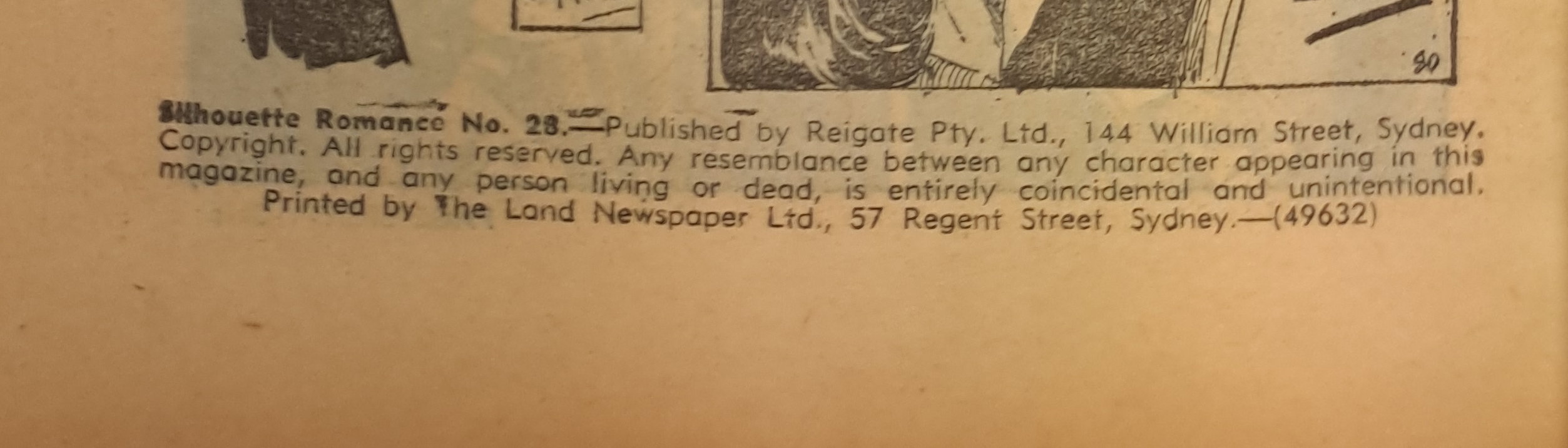 Silhouette Romance No. 28.--Published by Reigate Pty. Ltd., 144 William Street, Sydney. Copyright. All rights reserved. Any resemblance between any character appearing in this magazine and any person living or dead, is entirely coincidental and unintentional. Printed by The Land Newspaper Ltd., 57 Regent Street, Sydney.--(49632)
