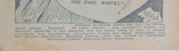 Published by Apache Comics Pty. Ltd., 144 William Street, Sydney. Copyright. All rights reserved. Any resemblance between any characters appearing in this magazine, and any person living or dead, is entirely coincidental and unintentional. Distributors: Gordon and Gotch (Australasia) Ltd. New Zealand Distributors: Marketing Services (N.Z.) Ltd. Printed by Cumberland Newspapers Limited, Macquarie Street, Parramatta.
