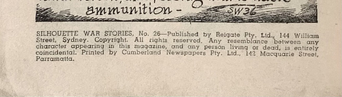 Silhouette War Stories, No. 26--Published by Reigate Pty. Ltd., 144 William Street, Sydney. Copyright. All rights reserved. Any resemblance between any characters appearing in this magazine, and any person living or dead, is entirely coincidental. Printed by Cumberland Newspapers Pty. Ltd., 142 Macquarie Street, Parramatta.