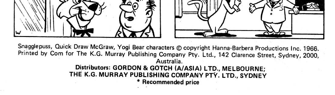Snagglepuss, Quick Draw McGraw, Yogi Bear characters © copyright Hanna-Barbera Productions Inc. 1966. Printed by Com for The K.G. Murray Publishing Company Pty. Ltd., 142 Clarence Street, Sydney, 2000, Australia. Distributors: Gordon & Gotch (A/asia) Ltd., Melbourne; The K.G. Murray Publishing Company Pty. Ltd., Sydney.